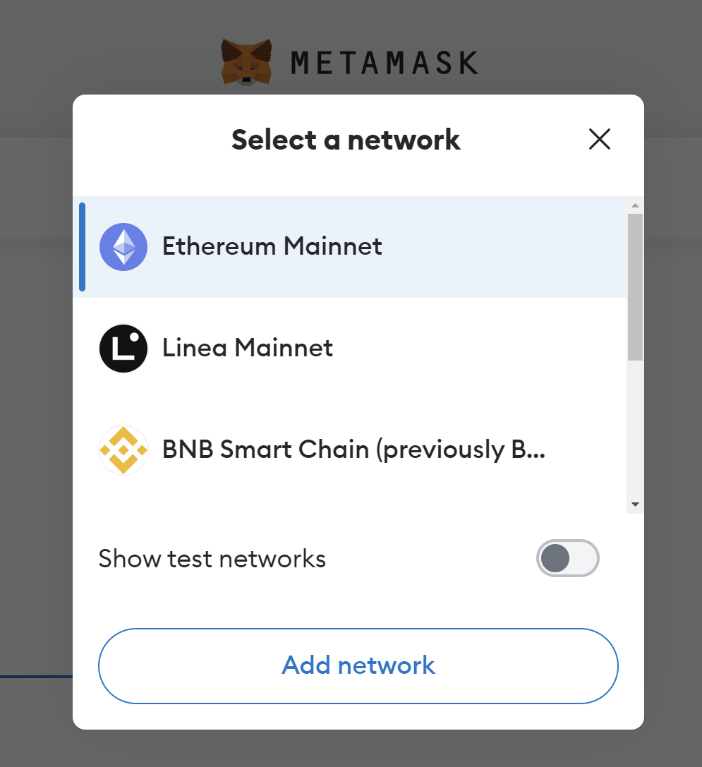 - Open MetaMask and click on the dropdown button at the top that says “Ethereum Mainnet”