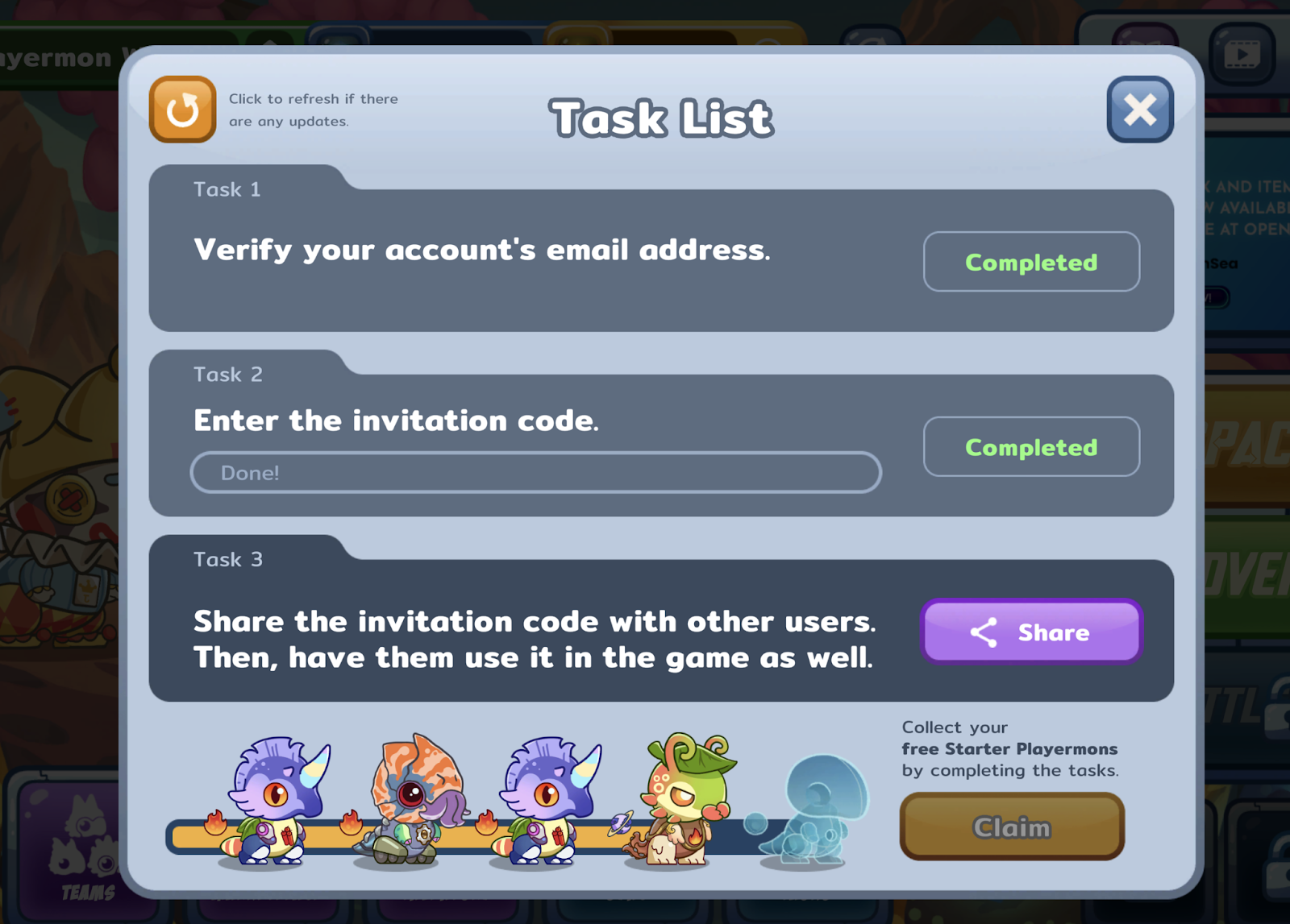 - After sharing, you will be able to collect your free starter Playermon if your friends use your invitation code in the game