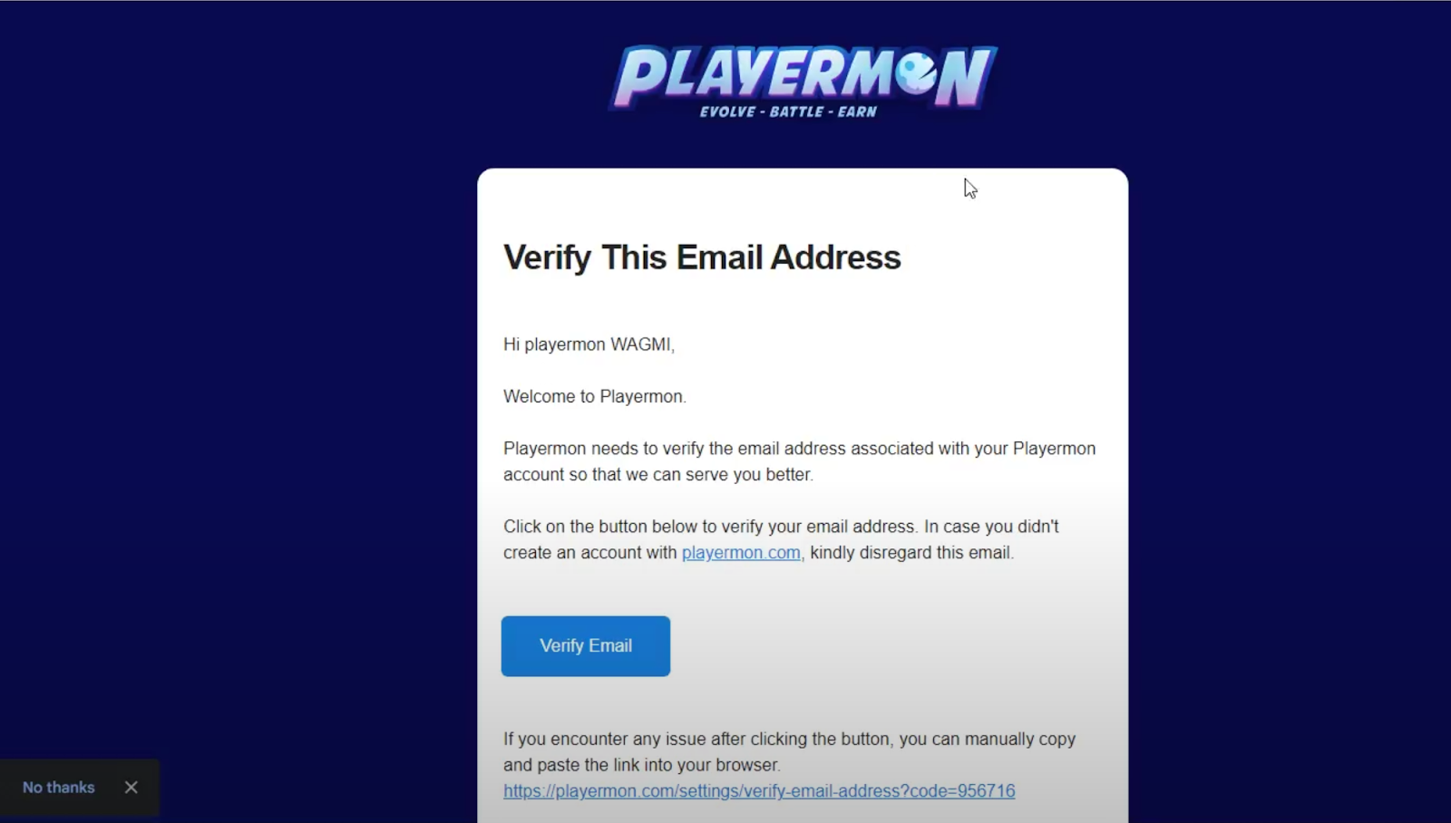 Return to the Playermon page. You'll receive a verification success prompt confirming your email. Congratulations! You have completed your first task, and now you're able to claim 3 starter Playermons.