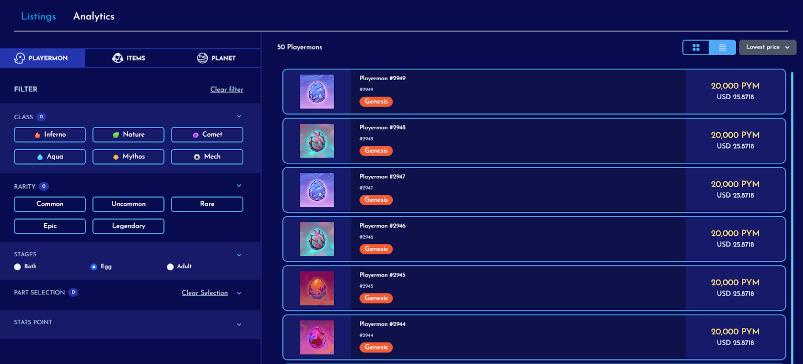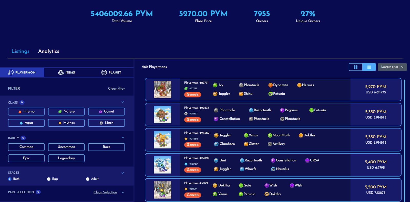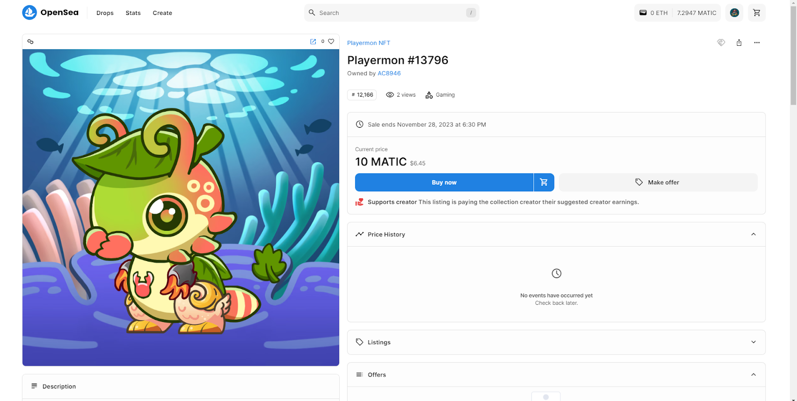 - Click on Playermon NFT that interests you to view its details, including images, descriptions, and seller information.